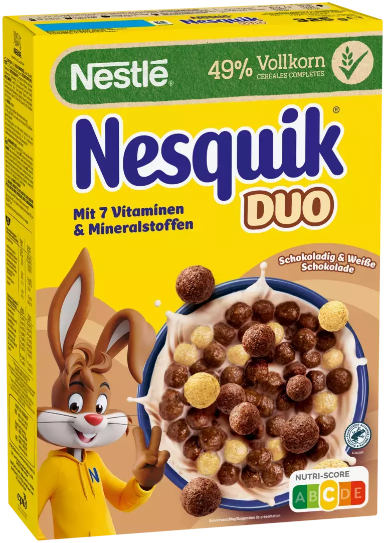 NESQUIK® Duo, eine Mischung aus schokobraunen und weißen Bällchen! Mit 49% Vollkorn sowie vielen Vitaminen und Mineralstoffen.