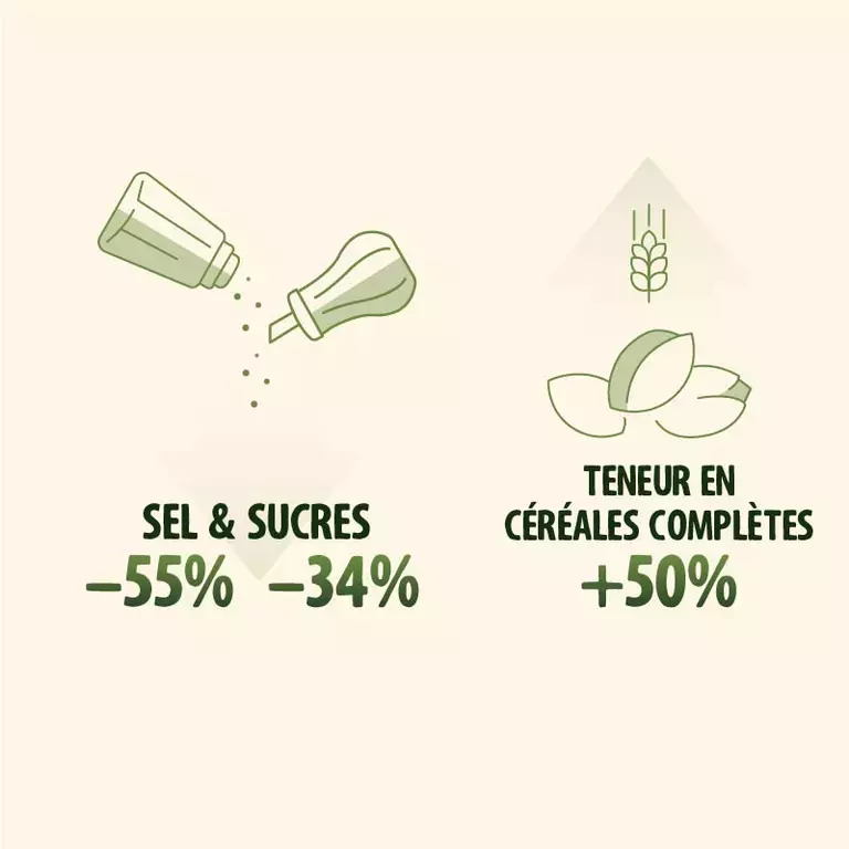 - Depuis 2005, nous avons progressivement amélioré nos recettes pour augmenter la part de céréales complètes, réduire le sucre, le sel et supprimer les colorants et arômes artificiels.