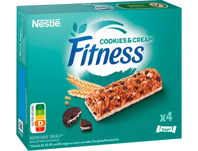 Entdecke unsere neuen Fitness Cookies & Cream Cerealienriegel: Ein leckerer Frühstücksriegel mit Kakaokeksstückchen. Er besteht zu 38 % aus Vollkorn als Zutat Nr. 1 und enthält Vitamine B2,B3, B5, B6, die zu einem normalen Energiestoffwechsel beitragen, und Calcium.