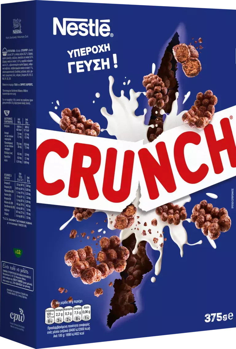 Τα τραγανά δημητριακά Crunch® με γεύση σοκολάτας κάνουν κάθε πρωινό σου μοναδικό! Σου προσφέρουν όλα τα οφέλη 7 βιταμινών, ασβεστίου και σιδήρου, για ακόμη πιο δυνατό ξεκίνημα. Γιατί δεν υπάρχει κάτι καλύτερο από το ξεκινάς την ημέρα σου με μια εκρηκτική γεύση!