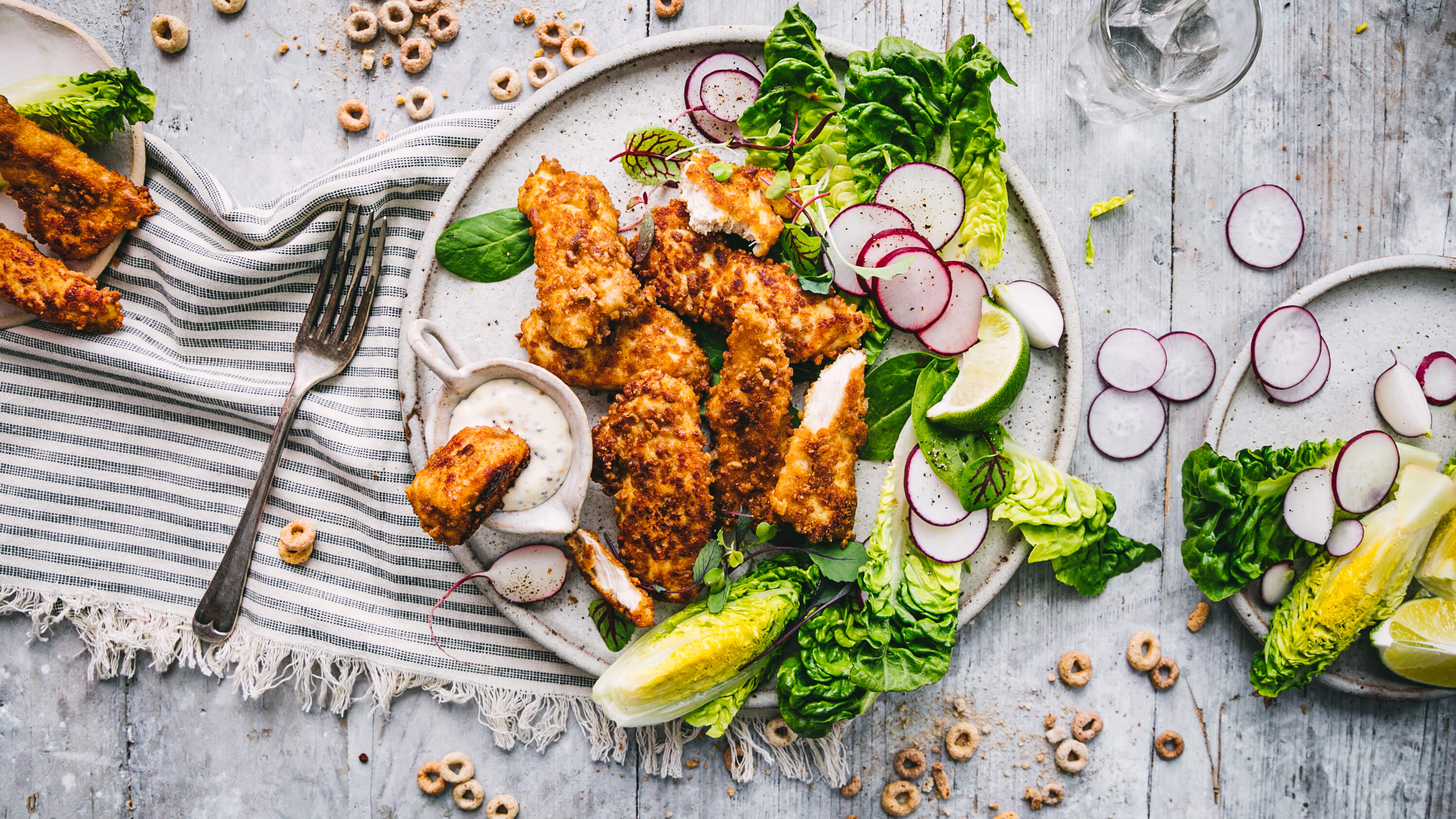 Καλύψτε το κοτόπουλο σας με ένα πασπαλάκι CHEERIOS® και σερβίρετε με το αγαπημένο σας ντιπ και λαχανικά για ένα νόστιμο τραγανό μεσημεριανό.