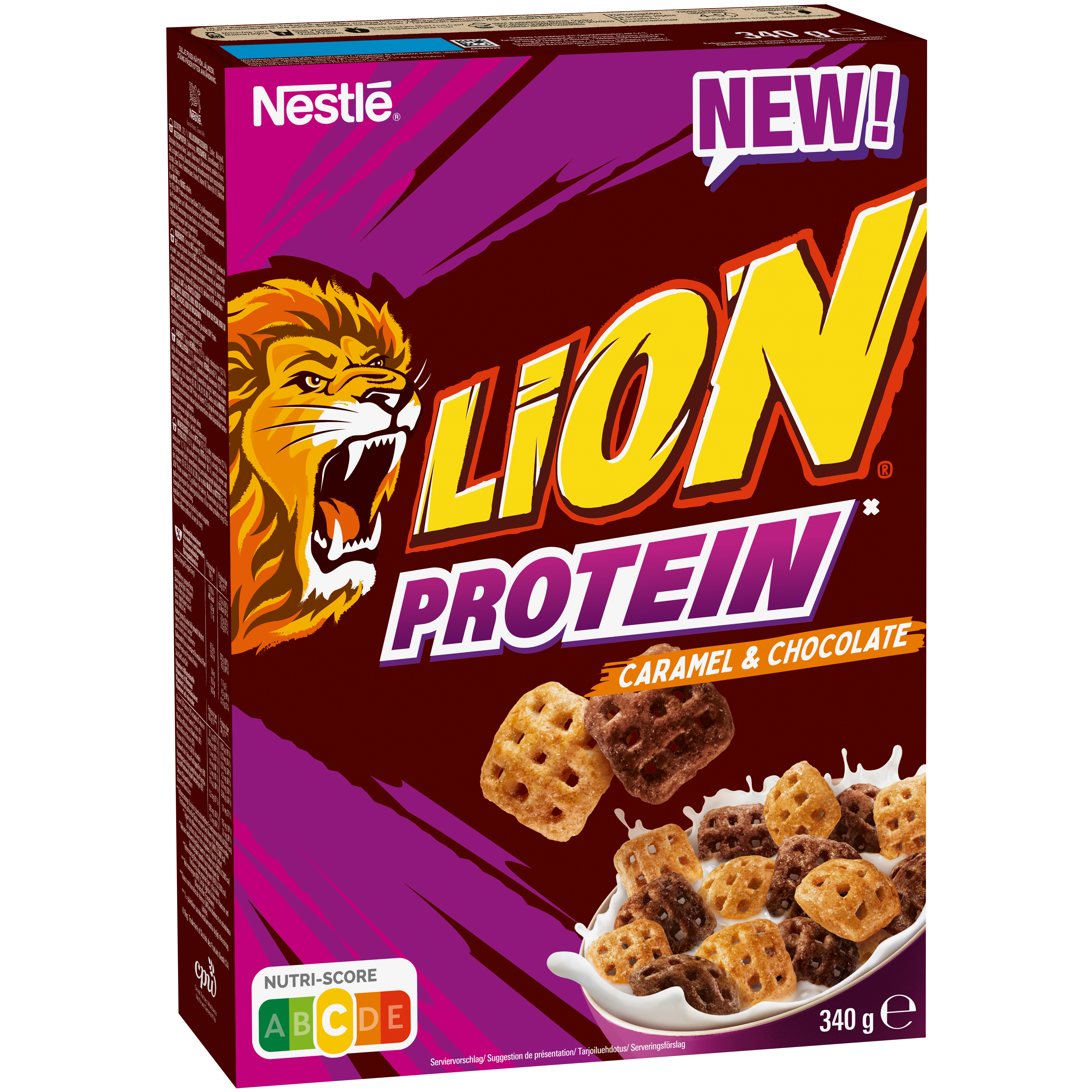 Upplev de spännande smakvariationerna hos NESTLÉ LION Protein frukostflingor – den ikoniska krispiga mixen du älskar, nu med 15 % tillsatt växtbaserat protein. En blandning av oemotståndlig choklad kombinerad med utsökta karamellflingor i våffelform, med en tillfredsställande krispighet i varje sked. LION Protein Chocolate & Caramel Frukostflingor är gjorda med fullkornsvete som nr. 1 ingrediens och är en källa till fibrer för att starta dagen.