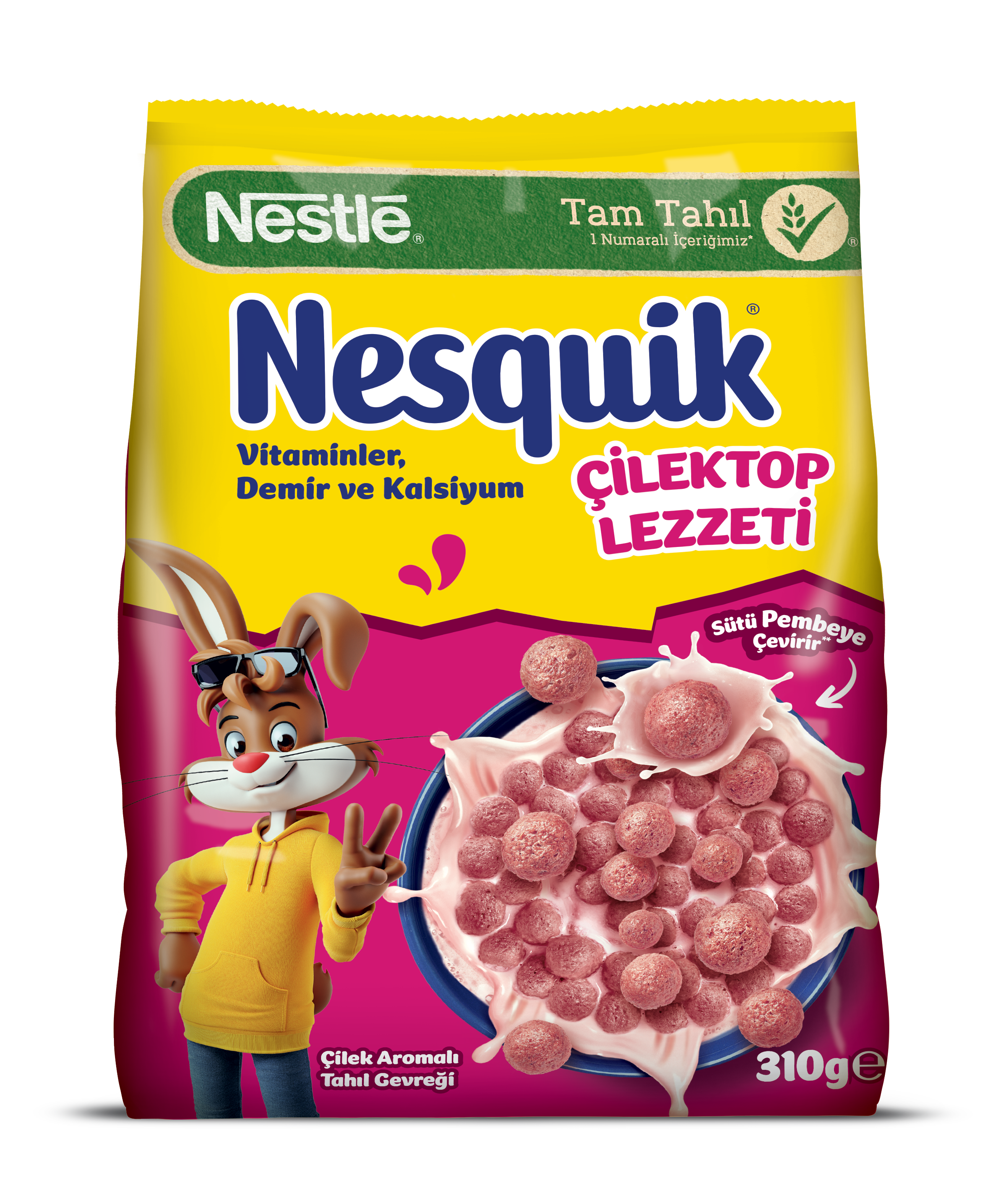 Yepyeni NESQUIK® ÇİLEKTOP LEZZETİ; tam tahıllı yapısı, içerdiği vitamin, demir ve kalsiyum ile çocukların severek tükettiği besleyici bir lezzet sunar. Günün en önemli öğünü kahvaltıya gönülsüz olan çocuklarımızın mutlu bir şekilde güne başlamalarını ve okul öncesinde besleyici bir kahvaltı etmelerini sağlayarak yardımcınız olur. Ayrıca pembe renkli Çilektoplar, sütle karıştığında sütü pembeye çevirerek kahvaltı zamanını daha eğlenceli hâle getirir.