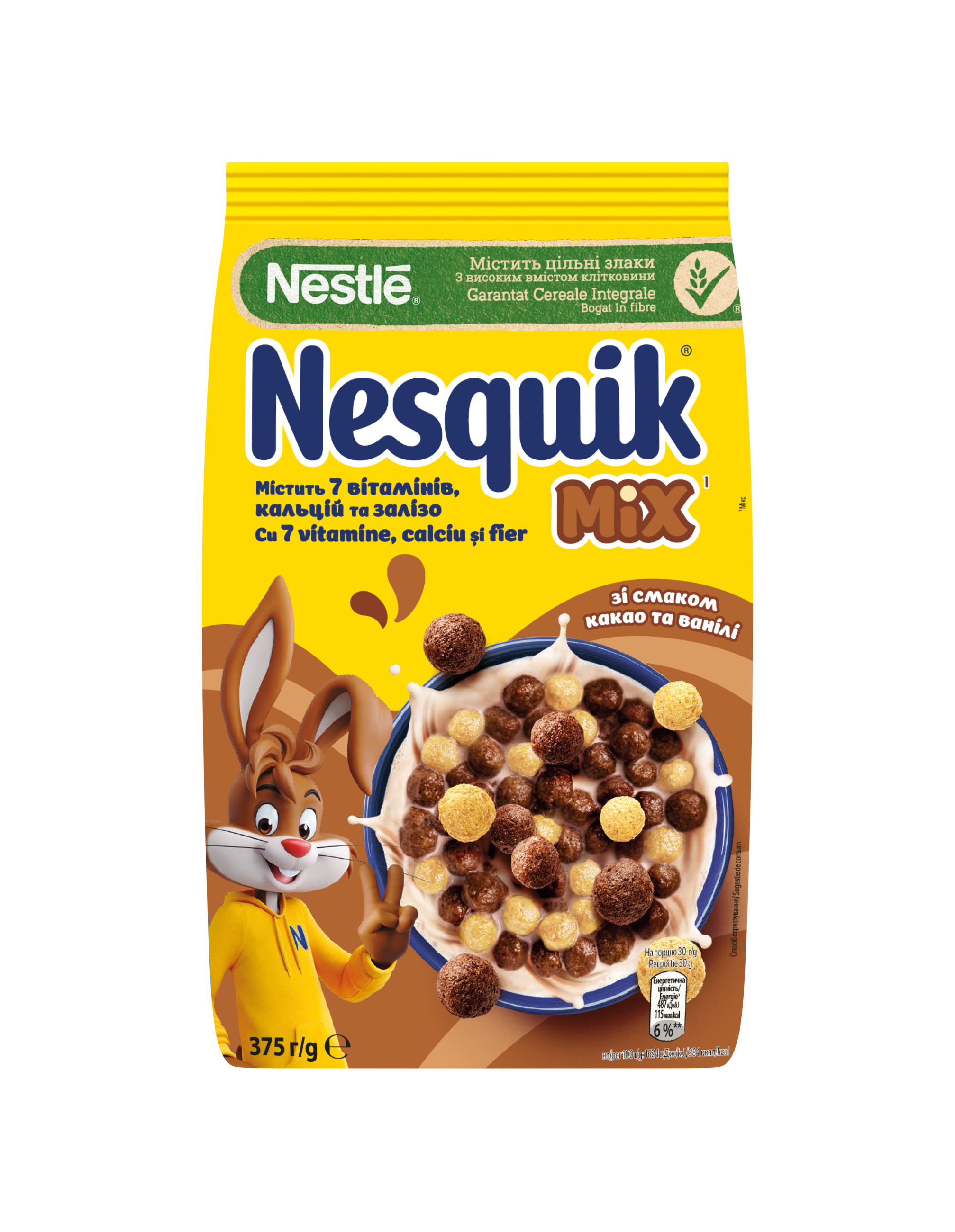Готовий сухий сніданок Nesquik® MIX (МІКС) – це чудове поєднання ванільних та какао кульок, завдяки яким сніданок перетворюється на гру! Готовий сухий сніданок Nesquik® MIX (МІКС) містить цільні злаки, вітаміни групи В, залізо та кальцій. Діти люблять готовий сухий сніданок Nesquik® МІХ (МІКС) за чудовий смак, а мами - за його поживність! Nesquik® - перша перемога успішного дня!